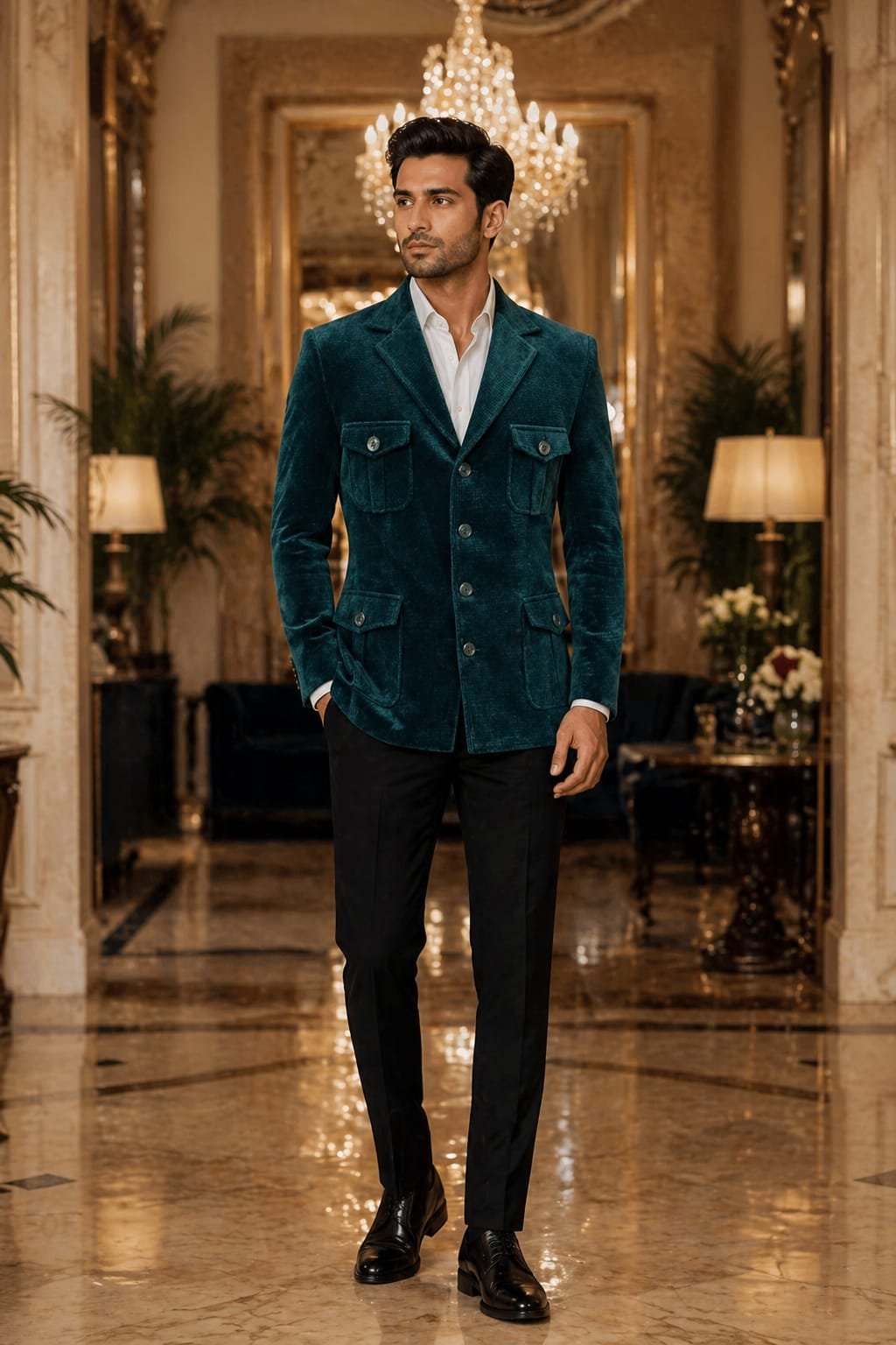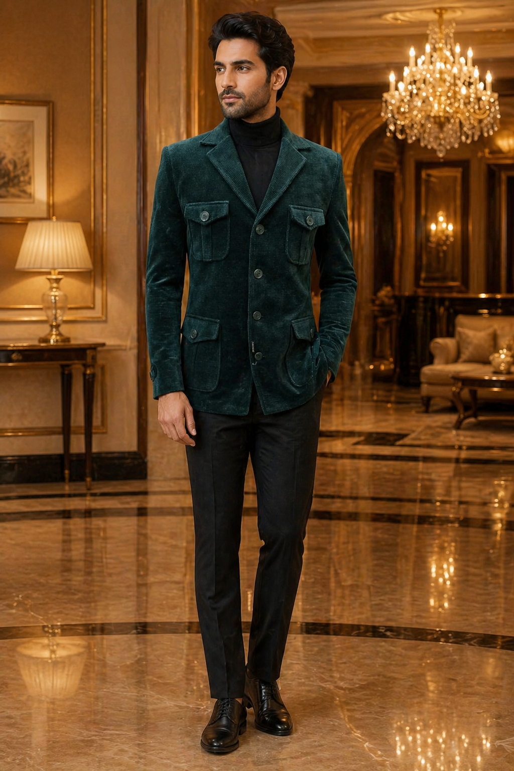 Step into sophistication with our Luxury Emerald Velvet Blazer, designed to make a bold yet refined statement. Tailored with precision, this blazer features a rich velvet texture that exudes elegance and class. The deep emerald green color adds a regal touch, making it ideal for special occasions like weddings, receptions, cocktail parties, and festive celebrations.
