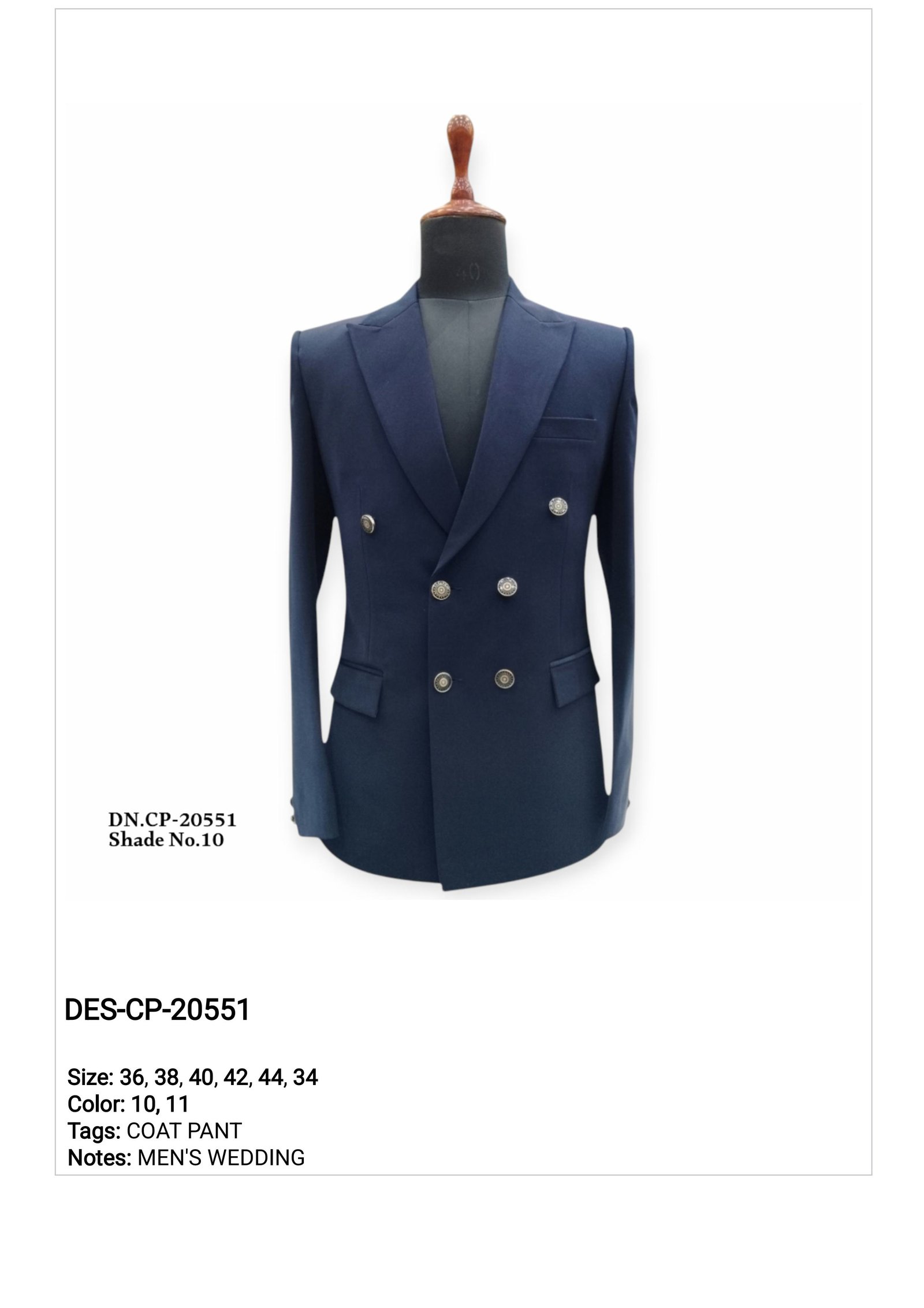 The blazer features a sharp peak lapel collar with premium metallic buttons in a double-breasted pattern, offering a classy and modern appearance. Crafted from high-quality suiting fabric, it ensures comfort, durability, and a structured fit — ideal for showroom display and bulk wedding stock.