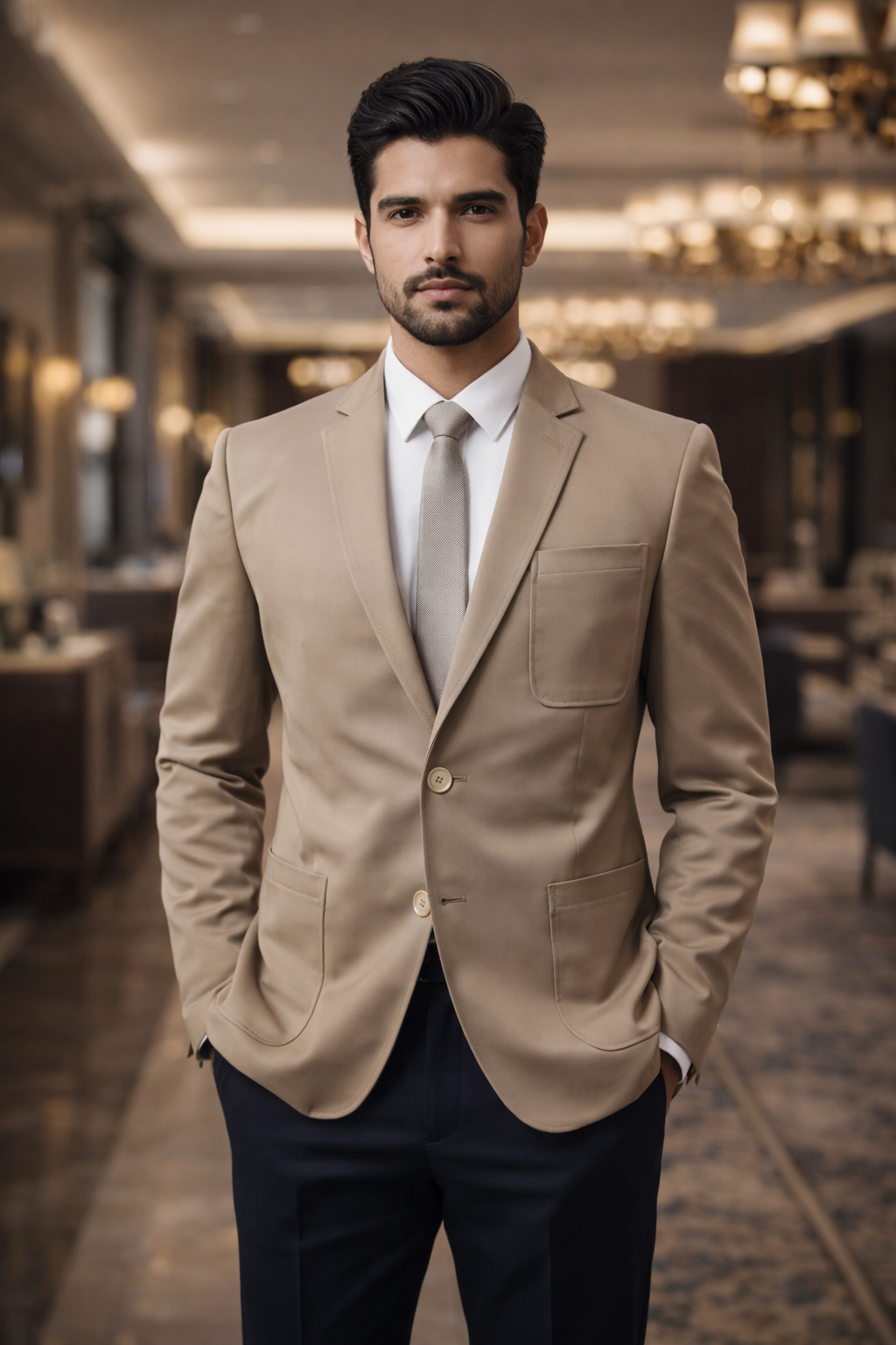 This model comes in Shade No.3, a sophisticated neutral tone that enhances its premium look. The blazer features a sharp notch lapel, two-button front closure, chest patch pocket, and stylish front patch pockets. Its structured cut ensures a clean silhouette and comfortable fit, making it ideal for wedding wear showrooms, retailers, and bulk buyers looking for trending men’s blazers in Delhi NCR and across India.